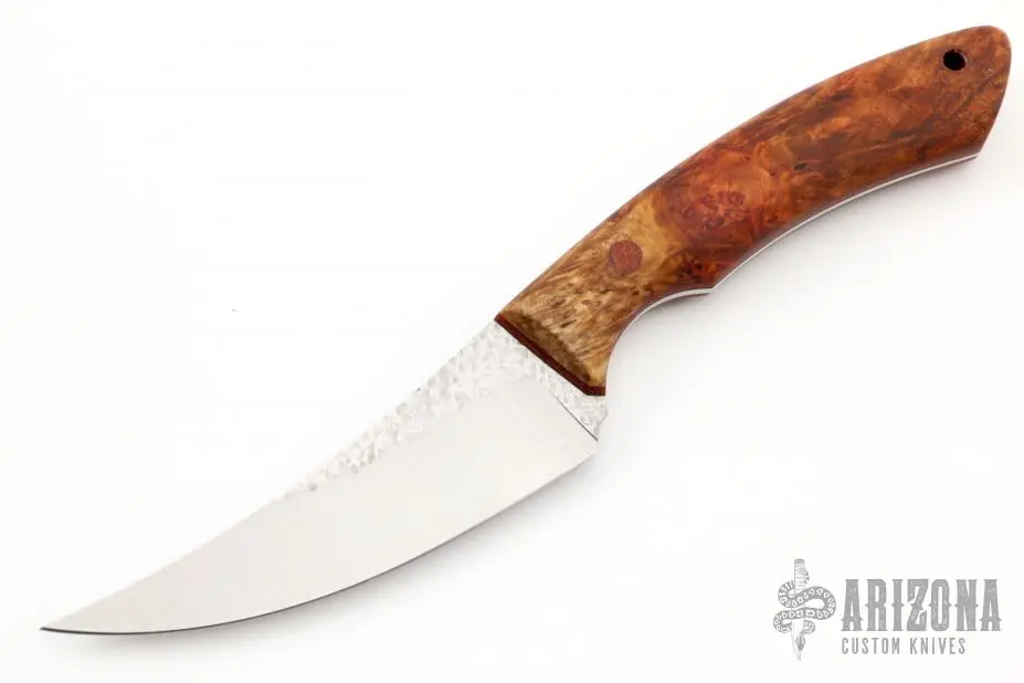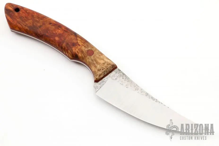 This knife by Chris Linton of Osprey Knife and Tool features a two tone blade with satin grinds and hammer marked flats, .099″ blade stock and 1.254″ blade depth, full tapered tang construction. The handle has Amboyna burl wood scales with red G-10 and natural canvas micarta liners. Excellent Condition.