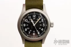 38mm matt stainless steel case, three hand display, dark dial with light, luminescent numerals, indexes showing hours and minutes, durable NATO strap: The new Khaki Field Mechanical is a faithful recreation of its original 1960s forebear and is true to Hamilton’s military heritage. Inspired by the military, built to last, this is the original soldier’s watch.