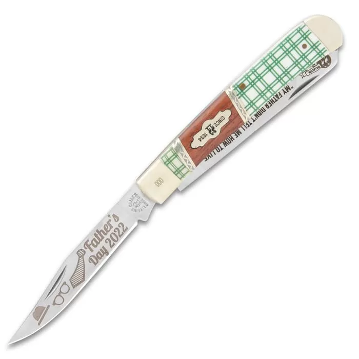 Honor your dad this year with the handsome Kissing Crane 2022 Father’s Day Trapper Pocket Knife. The pocket knife has two stainless steel blades that are etched with a Father’s Day message and 2022 Father’s Day artwork. The handle scales are white bone with a green plaid etching and brown wood, complemented by nickel silver bolsters. The trapper knife is 4”, when closed, and the handle features brass liners and the classic Kissing Crane shield.