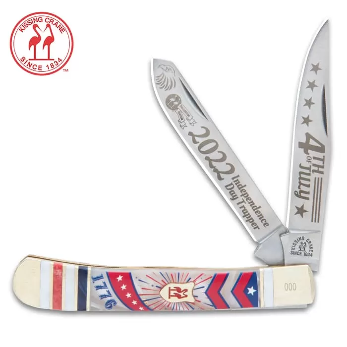 The Kissing Crane 2022 Fourth of July Trapper is an eye-catching, collectible tribute to the birth of our nation. It has two, razor-sharp stainless steel blades laser-etched with Fourth of July-themed artwork including “2022” and “Independence Day.” The blades can be deployed manually with nail nicks. The handle scales are faux pearl 3D-printed with a 1776 theme, accented with red, white and blue resin bands and brass spacers. Polished nickel silver bolsters, a brass liner and the classic Kissing Crane cast shield complete this exquisite design. Each one is laser serialized on the bolster.