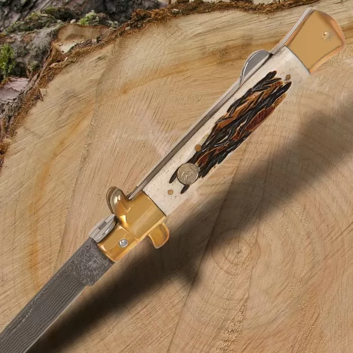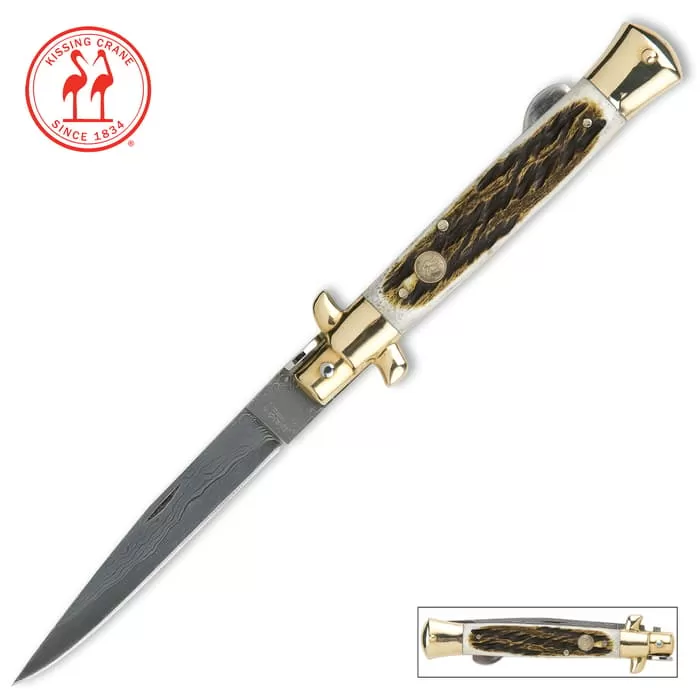 The all-new Kissing Crane Burnt Bone Stiletto features a genuine bone handle with a burnt texture that gives it a rustic appeal. The razor-sharp stiletto blade is of striking Damascus steel. It also features attractive brass plated pins, bolsters and the signature Kissing Crane cast shield. We know you have someone in mind to give this attractive stiletto to!