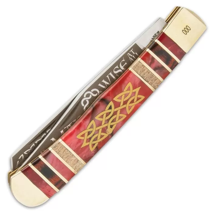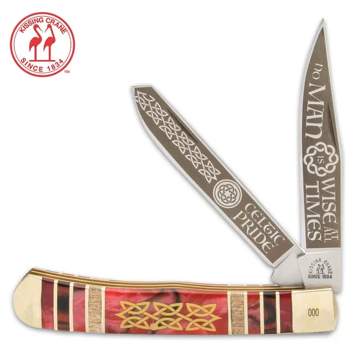 Commemorate your Celtic heritage and pride with the Kissing Crane Celtic Blood Trapper, an heirloom quality knife worthy of any Irishman. It has keenly sharp and resilient 440 stainless steel clip and spey blades, laser etched with Celtic-themed art and text. The handle scales are comprised of a burgundy acrylic panel etched with Celtic knotwork, accented with different colors of wooden bands, separated by stainless steel spacers. Nickel silver bolsters and a brass liner complement the distinctive handle scales and one of the bolsters is individually serialized. The trapper pocket knife is 4 1/2ā, when closed, and the cast Kissing Crane assures you of the quality craftsmanship.