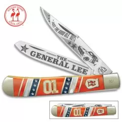 “Just the good ole boys” want this Kissing Crane trapper pocket knife, which pays tribute to that iconic bright orange Charger, “The General Lee”. The trapper has two sharp 440 stainless steel blades, which feature The General Lee themed etchings and our limited edition stamp. The handsome handle is made of genuine orange bone, accented with pearl bands, blue and red bands and brass spacers. The pocket knife also features gleaming brass liners and an individually laser serialized bolster, which assures you of its collectible status. The trapper pocket knife has a 4″ closed length and the handle features the classic Kissing Crane shield.