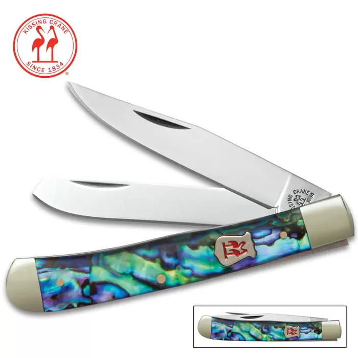 Experience the unrivaled quality of Kissing Crane knives first-hand with their genuine abalone family of knives. This Trapper offers elegant, genuine abalone handle scales that each look different. Each knife is accented by nickel silver bolsters and pins, and features razor-sharp stainless steel blades with the world renown Kissing Crane logo stamped right on the blade.