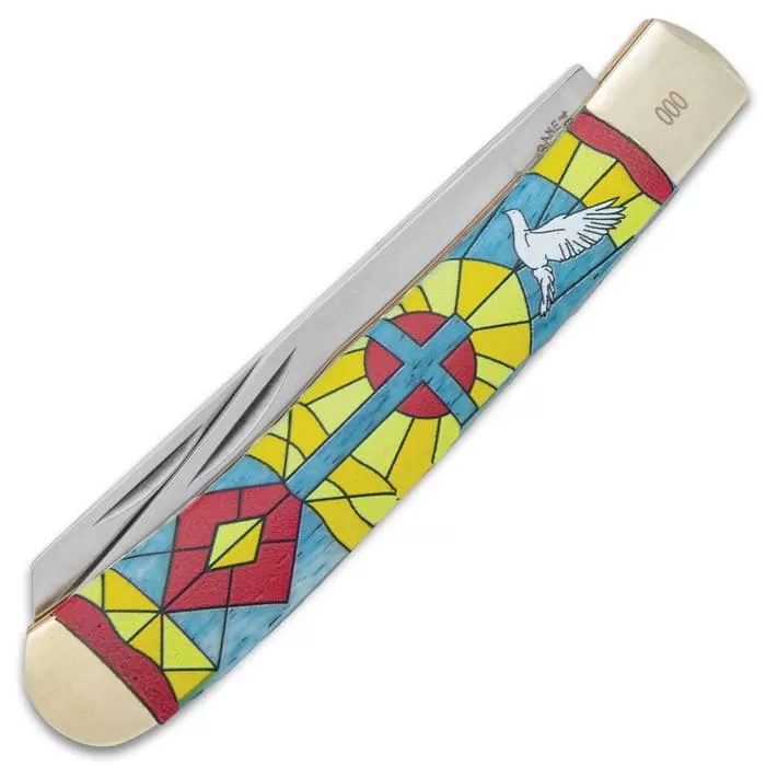 The Kissing Crane Stained Glass Trapper was inspired by the legendary stained glass windows in the grand cathedrals of Europe. The handle scales are made of blue bone, providing a background that shows of the red and yellow 3D-printed cross artwork and its white dove in flight. The polished nickel-silver bolsters and brass liners are attractive complements to the beautiful handle. The trapper has two stainless steel blades that have nail nicks for easy opening. One of the blades has the Kissing Crane stamp of authenticity.