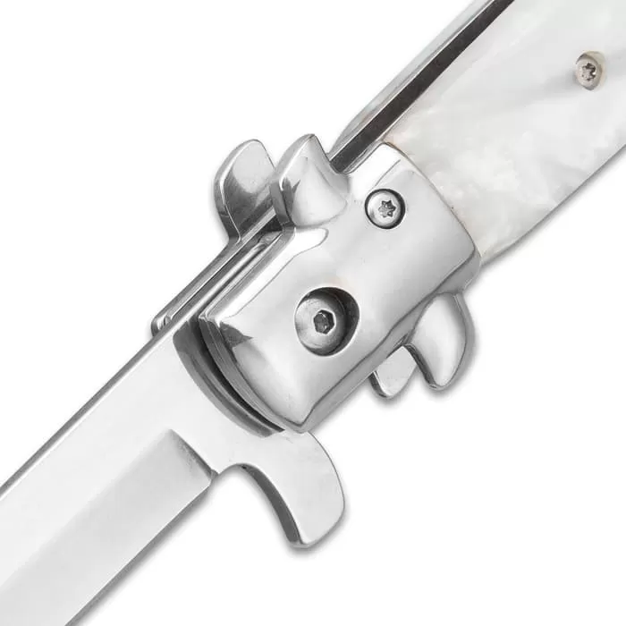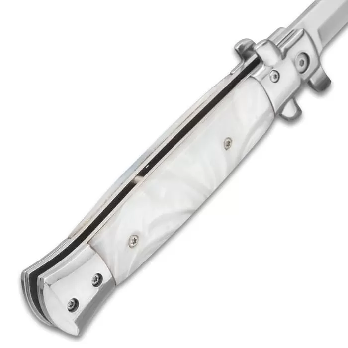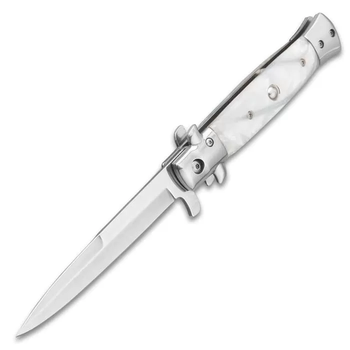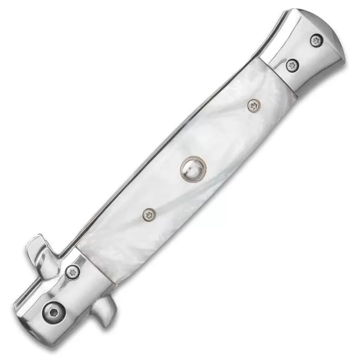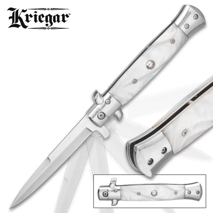 Kriegar German White Pearl Stiletto Knife – Stainless Steel Blade, Assisted Opening, Faux Pearl Handle, Stainless Bolsters And Pins