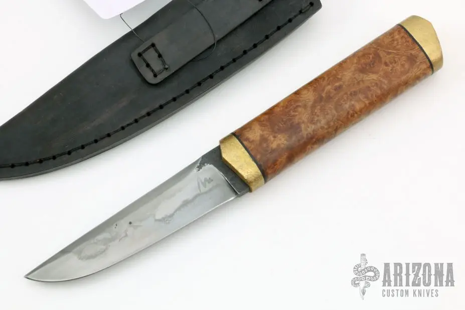 This Custom Kwaiken by Murad Custom Knives features a hand rub satin finished blade with forge finished flats and nice hamon, .230″ blade stock and 1.048″ blade depth, hidden tang construction. The handle has a textured brass guard and butt with amboyna burl wood grip with black and brass spacers. Comes with a black leather sheath and COA. New from maker.