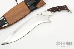 This Large Fighter by Joe Knuth features a mirror finished blade with a false top edge, .307″ blade stock and 2.909″ blade depth, full tang construction. The handle has stainless steel bolsters and butt, checkered black linen micarta scales. Comes with a wooden scabbard with leather belt loop. Signed and dated 6/92 and #423 on the bolsters. Has some light scuffs and scratches, otherwise excellent condition.
