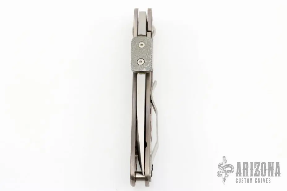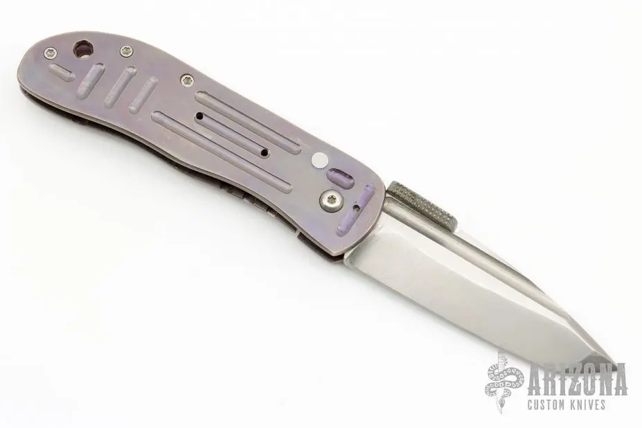 This left handed framelock by Southpaw Knives features a chisel ground tanto blade with a checkered Damascus thumbdisc and fuller. The handle has a milled and anodize finish scale and frame and tip up clip. Marked FL2 on ricasso. Has some scratches and scuffs, lacks refinement, otherwise good condition.Â