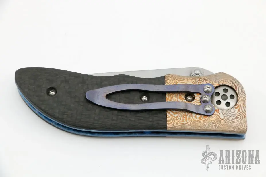 This linerlock by Allen Elishewitz features a stonewash finish blade with a dual thumbstuds. The handle has contoured carbon fiber scales, anodized titanium liners, mokume bolsters, and blue posts. Strong lock up, and nice detent. Comes with original nylon sheath. Has some light scuffs and scratches, Excellent condition otherwise.Â