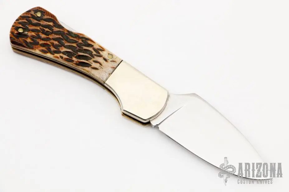 This Prototype Lockback Folder by Tak Fukuta features a mirror polished blade with nail nick. The handle has a nickel silver bolsters and brass liners, jigged bone scales, stainless steel backspacer and lock. Has a few light scratches, otherwise excellent condition.