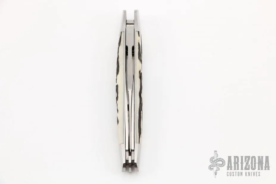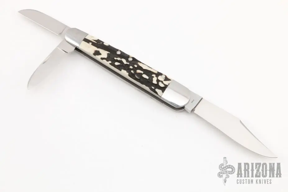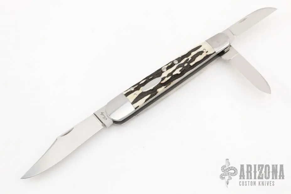This Lockback Whittler by Eugene Shadley features a large single blade that is engaged by the lockback. The remaining two blades are slipjoints, they both have halfstops and are flush in all positions. All blades have a hand rub satin finish. The handle has stainless steel bolsters, stag covers with a stainless steel escutcheon, stainless steel liners and springs. Includes a padded zippered case. Excellent Condition. Â #1245