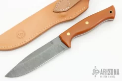 This M4 by Jason Isley features an acid washed drop point blade, .155″ blade stock and 1.236″ blade depth, full tang construction. The handle has caramel paper micarta scales, brass pins and lanyard hole. Comes with a brown leather sheath. New from maker.Â