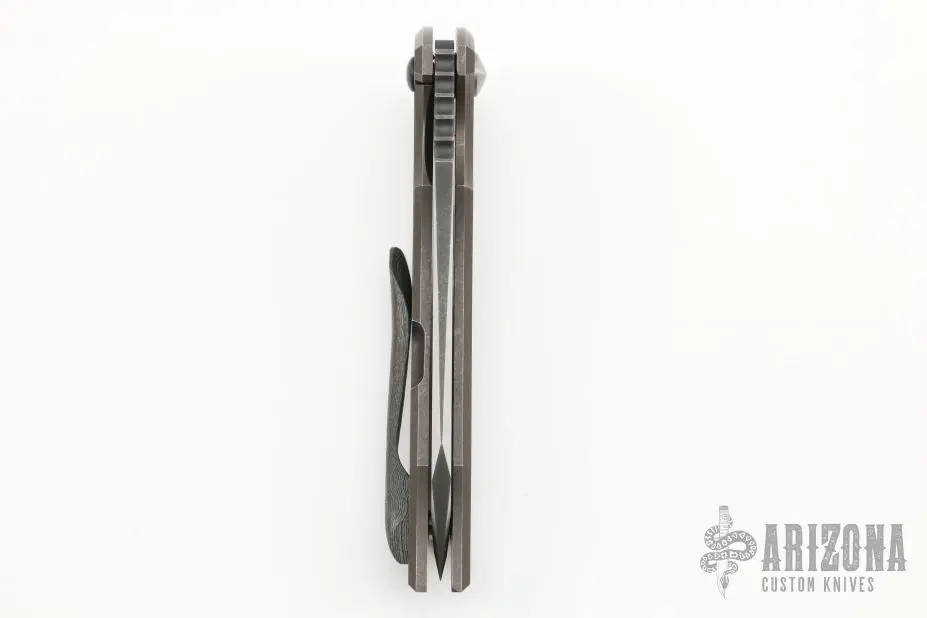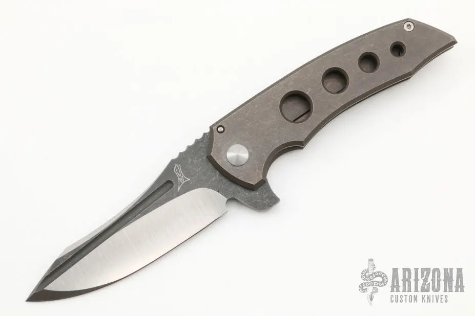 This Marsh MAC Roxstar flipper from Jeremy Marsh features a two-tone blade with notched thumbrest and flipper. The handle has a tumbled titanium frame with a ZircuTi pocket clip is positioned for tip up carry and has hidden screws. This piece is numbered #163. Includes the a Velcro case. Â Excellent condition.