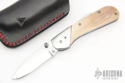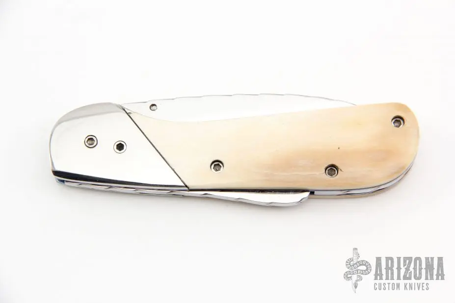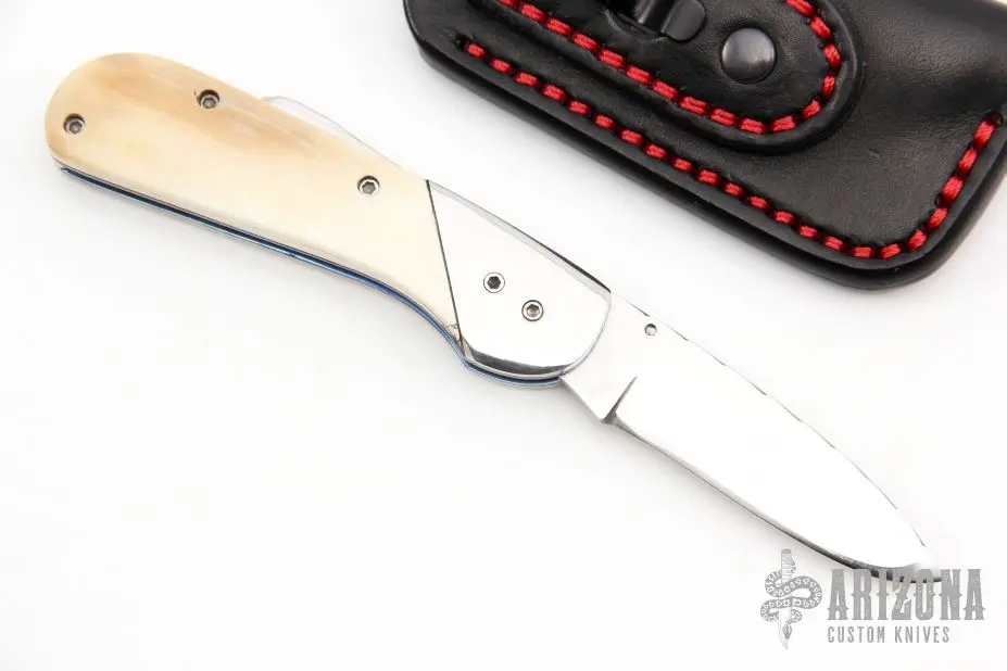 This folder by Center Cross Metal Works features a mirror polished blade with single thumbstud and fileworked spine. The handle has stainless steel bolsters, mammoth ivory scales, anodized titanium liners with fileworked spines, fileworked stainless steel backspacer. Comes with a black leather pocket sheath with clip. Has a few light scratches, otherwise excellent condition.Â