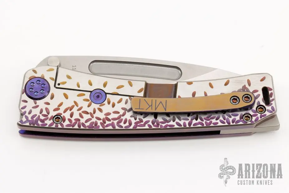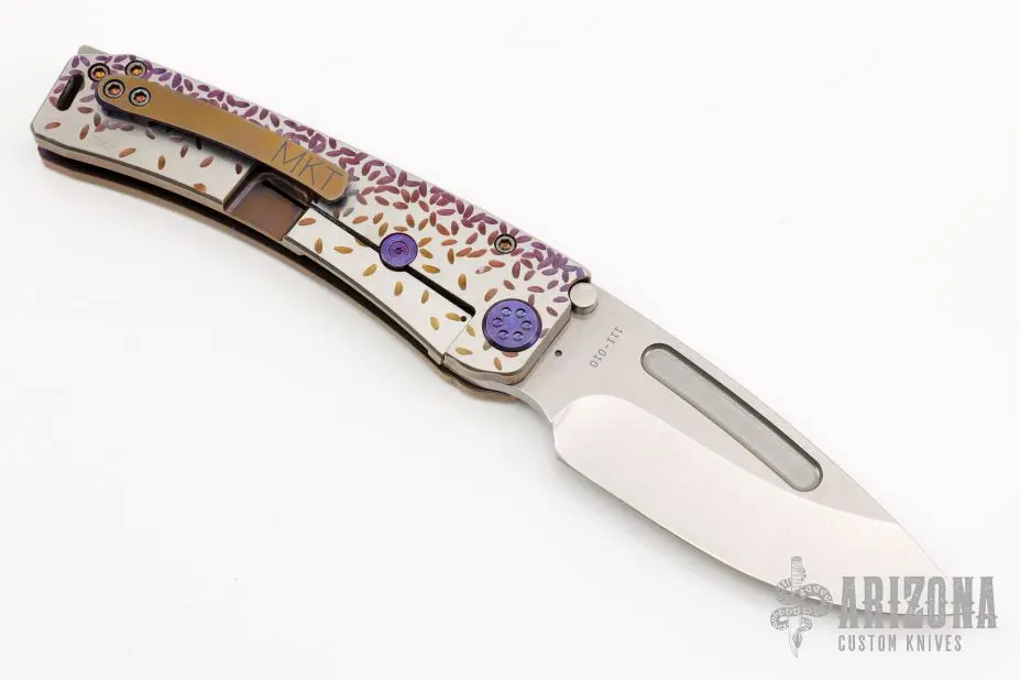 This Marauder from Medford Knife and Tool features a tumbled blade with fullers. The handle has a textured and anodized titanium frame over a steel backspacer and titanium tip up clip. Includes original box, papers and hard case. Excellent Condition. Â