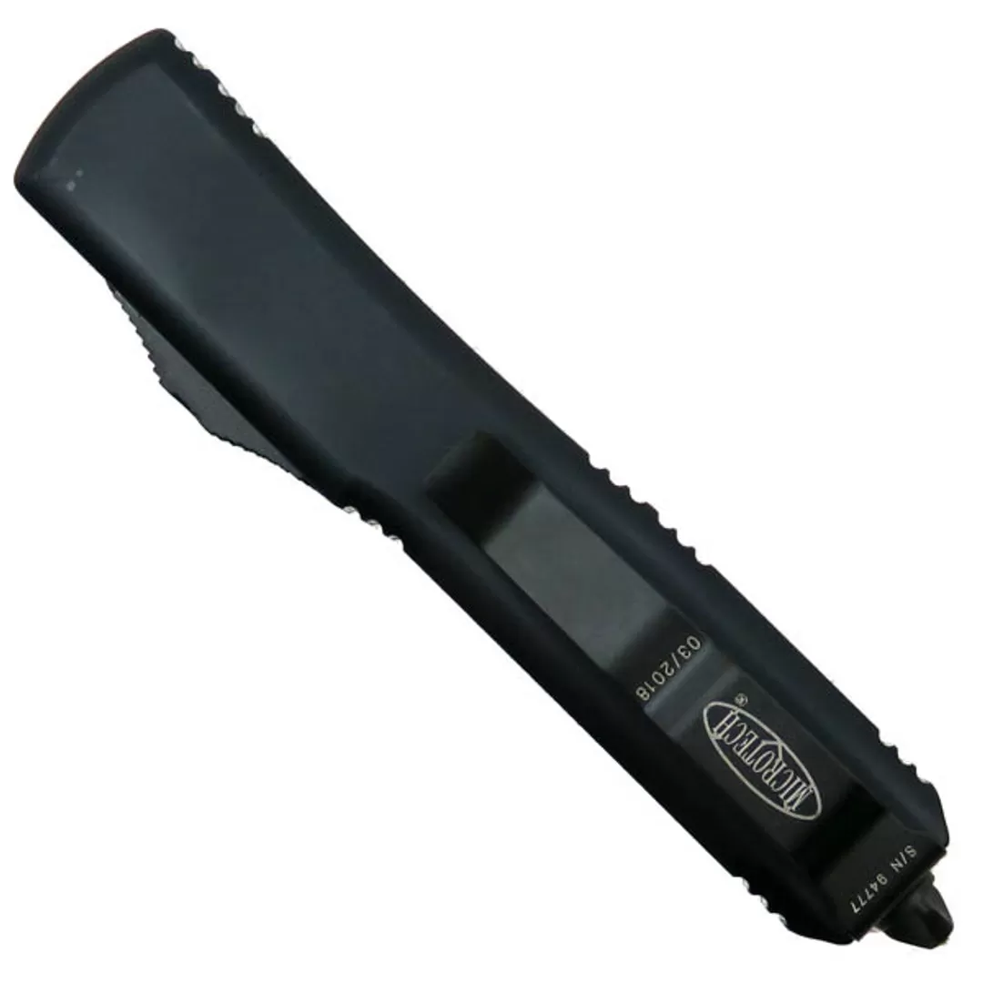 The Ultratech without question has been Microtech’s flagship out the front auto knife since its induction in 1999. Recently it has gone through an additional aesthetic redesign after the overwhelming success and praise of the traditional styling. While the dimensions of the Ultratech remain unchanged, the handle has been stripped back down to its original roots–now offering a smooth contoured chassis, however still boasting the tri-angle hardware, a redesigned thumb slide and the glass breaker that now includes a press fitted ball bearing for a more comfortable, but still functional, user experience. Each Microtech OTF knife has extremely sophisticated internal mechanisms which improve the overall operational functionality and reliability. This model features a contoured black handle complete with all-black hardware and an integrated glass breaker function along with a partially serrated drop point style blade in a black finish. Made in the USA.