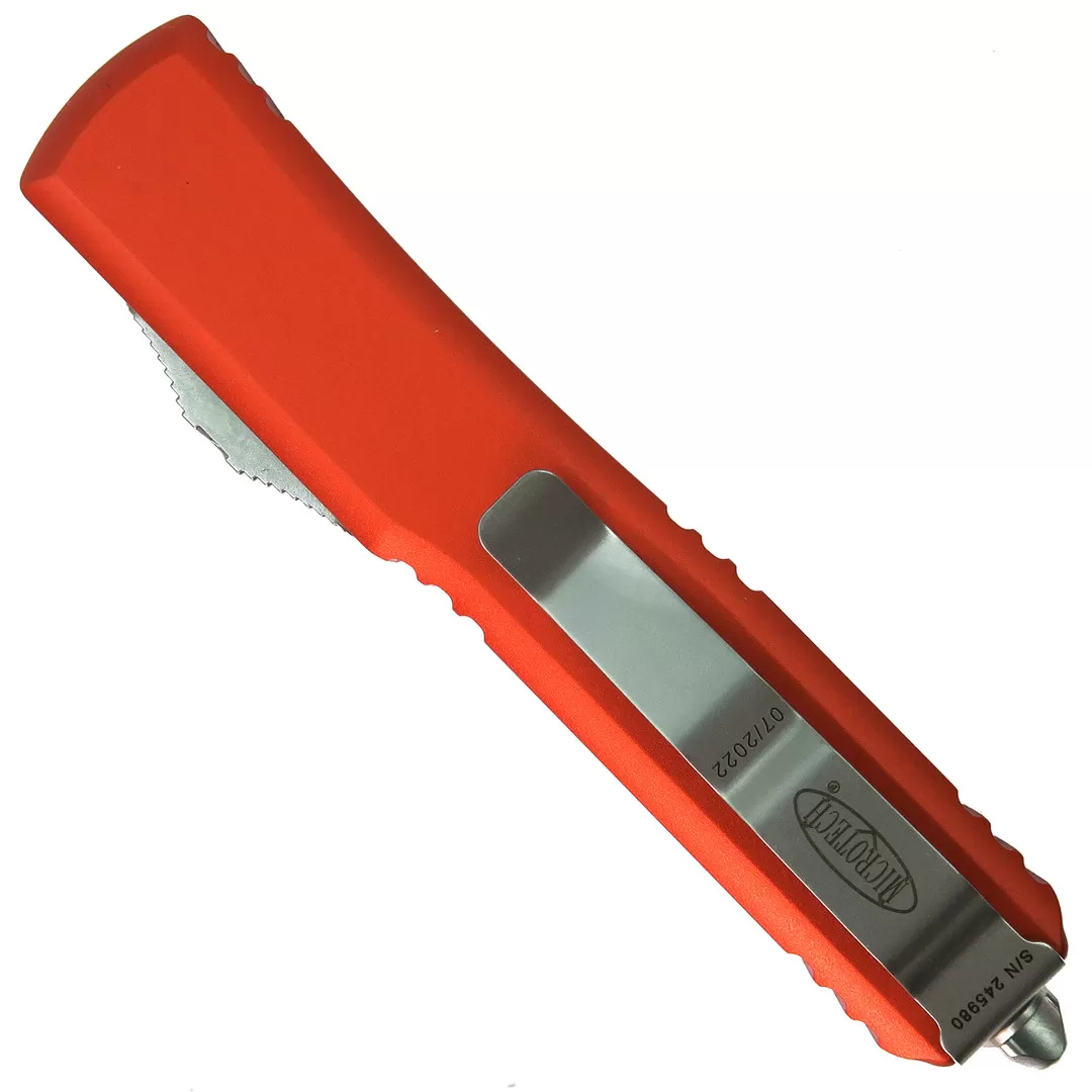 This Microtech Ultratech out the front knife features a contoured orange handle complete with standard bead blasted hardware and an integrated glass breaker function along with a dagger style blade in a stonewash finish. One side of the blade is fully serrated.Â