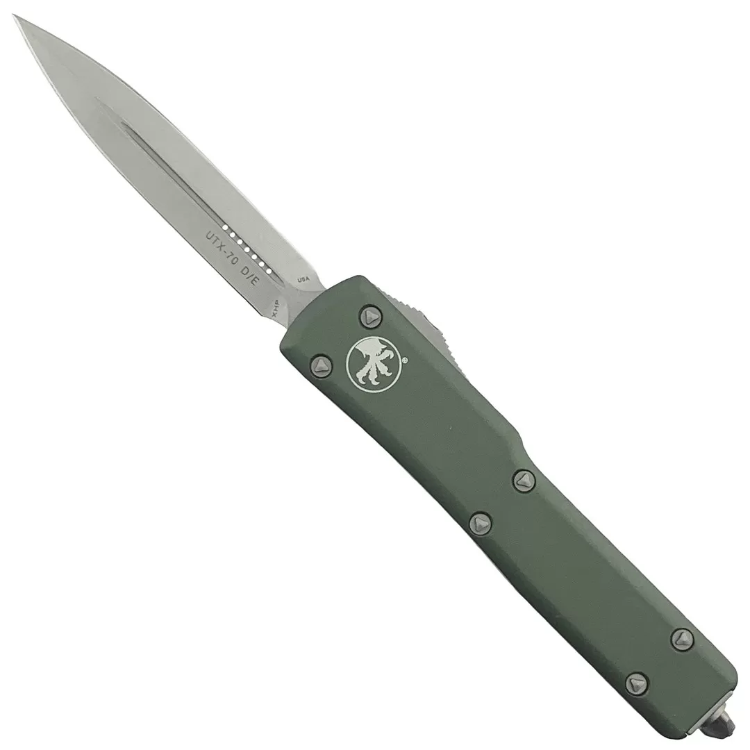 The radically redesigned and compact UTX-70 out the front knife is now features a new contoured handle, updated tri-angle hardware, a redesigned thumb slide and was built to be a hard-use cutting tool without the size and weight of traditional models. This fantastic dual action knife is the ideal size and as the name exhibits, the UTX-70 is 70% the size of the flagship Ultratech knife but with 100% of the capability. This model features an olive drab green anodized aircraft-grade aluminum handle complete with standard bead blasted hardware along with a dagger style blade in a stonewash finish. Made in the USA.