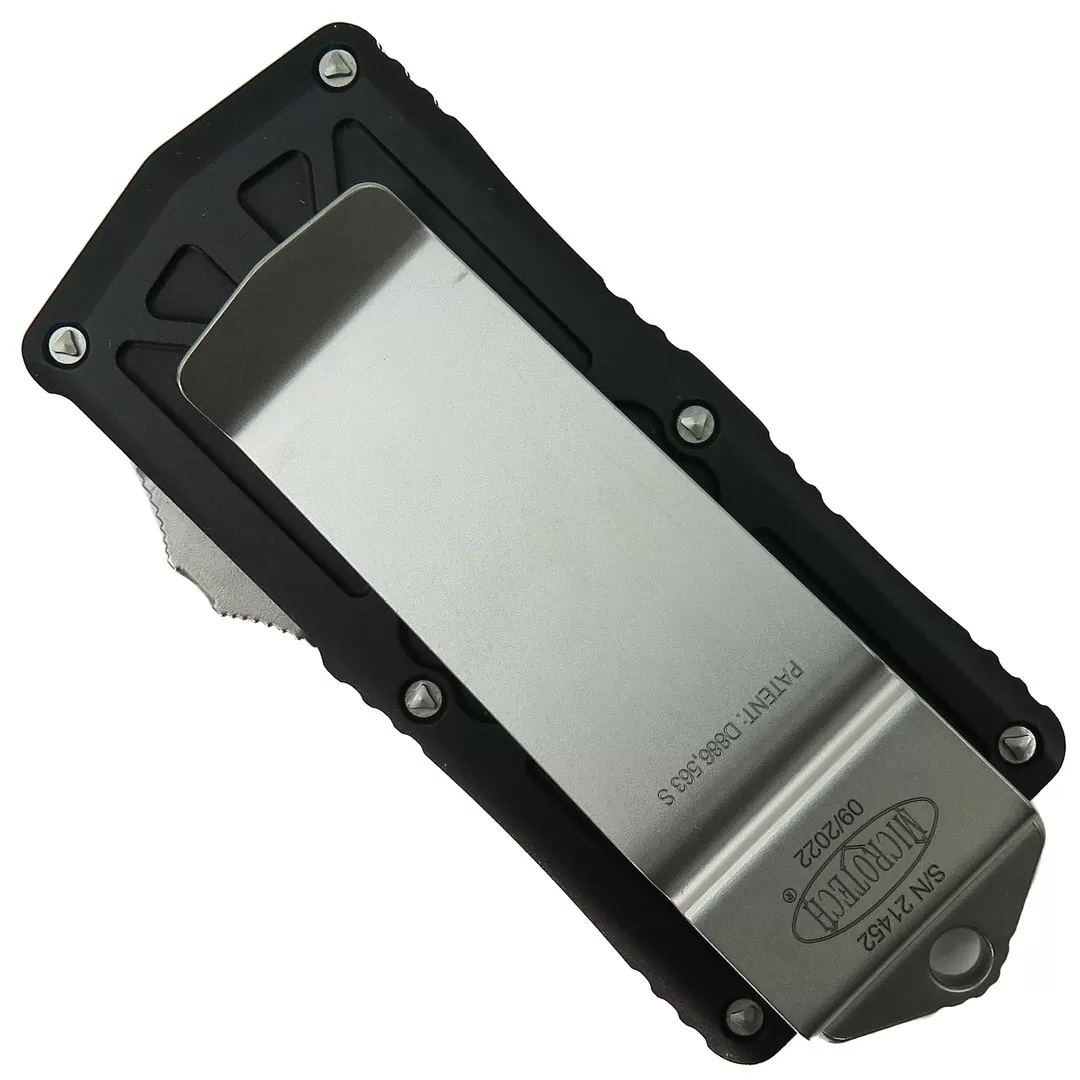This Microtech Exocet out-the-front knife features a black anodized handle and a stonewash finished M390 dual-edge blade with one fully serrated edge and one standard edge.