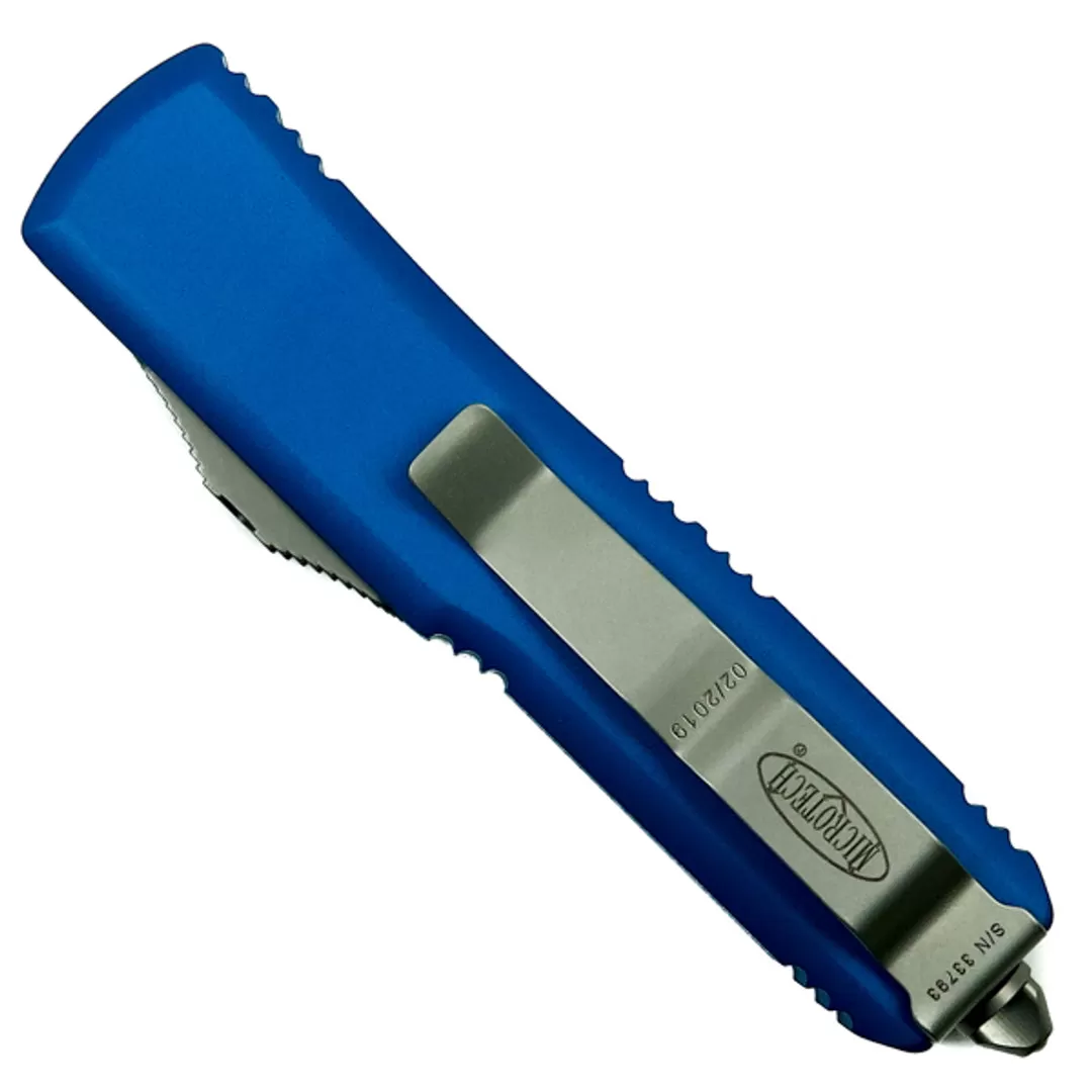 The radically redesigned Microtech UTX-85 out the front knife now features a new contoured handle, updated tri-angle hardware, a redesigned thumb slide and the glass breaker that now includes a press fitted ball bearing for a more comfortable, but still functional, user experience. This fantastic dual action knife is the ideal size and as the name exhibits, the UTX-85 is 85% the size of the flagship Ultratech knife but with 100% of the capability. This model features a blue anodized handle complete with standard bead blasted hardware and an integrated glass breaker function along with a dagger style blade in a stonewash finish. Made in the USA.