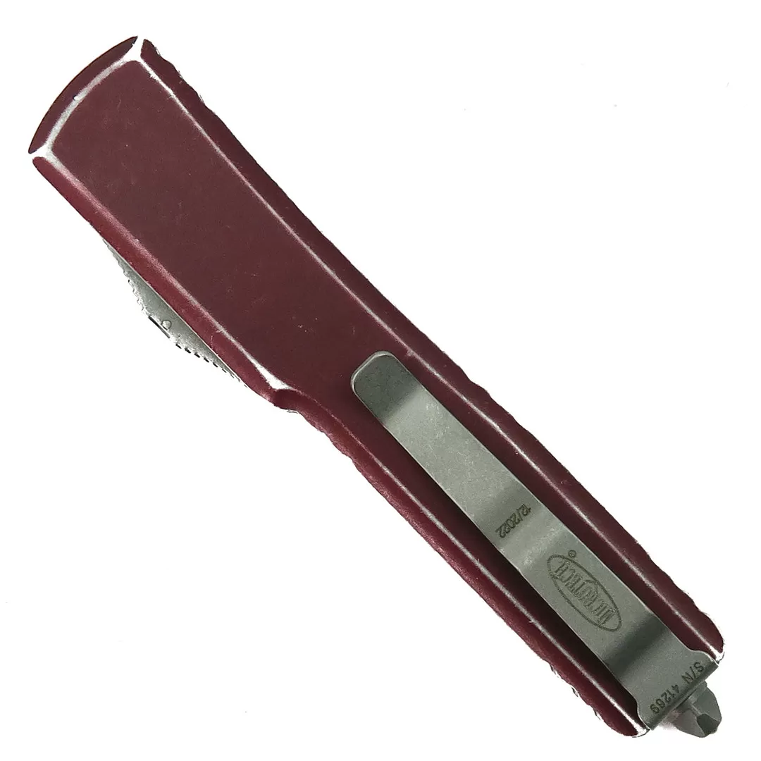 This Microtech UTX-70 OTF knife features a distressed merlot anodized aircraft-grade aluminum handle and an apocalyptic stonewash finished dagger blade.