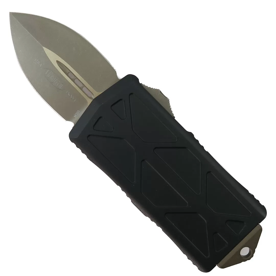 This Microtech Exocet out-the-front knife features a black anodized handle and a dagger style blade with a bronze apocalyptic stonewash finish.