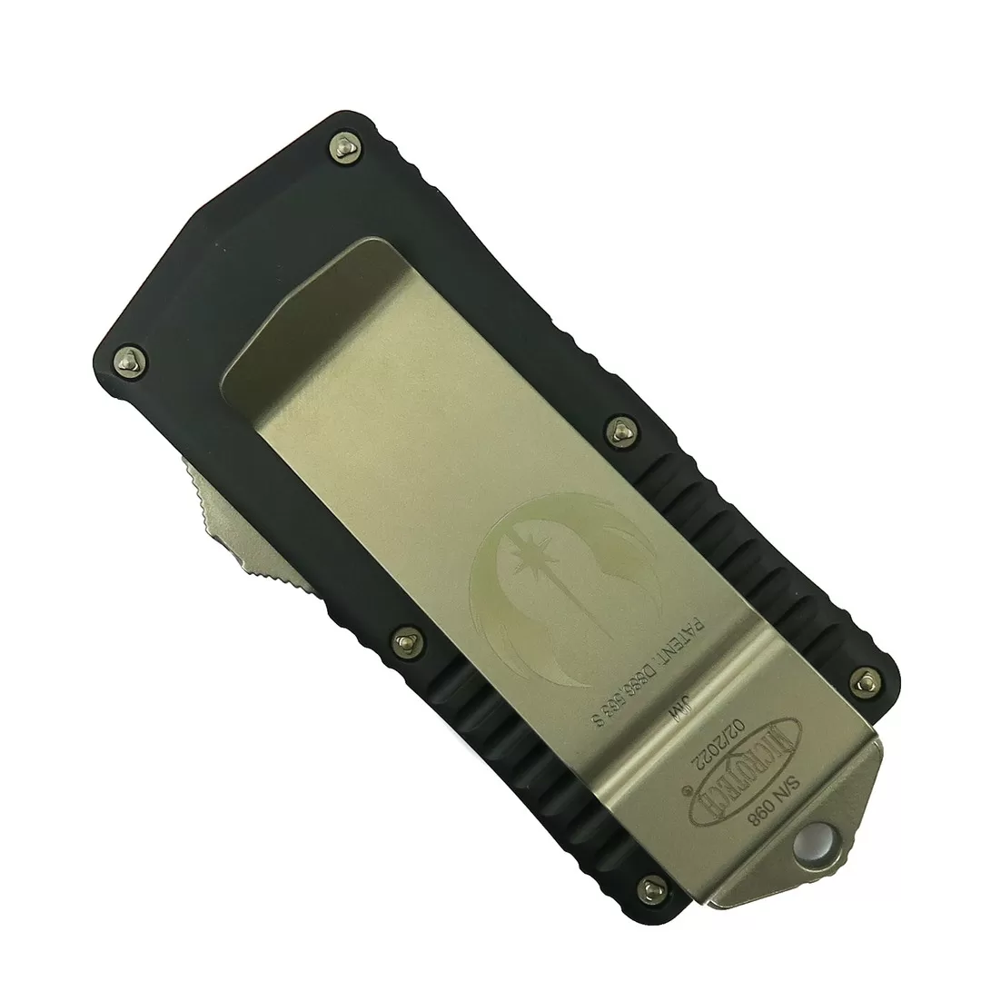 The front of the handle features 3 circle patterns and the clip features the S/N, the Microtech Oval Logo, the birthdate, and the Jedi Logo.