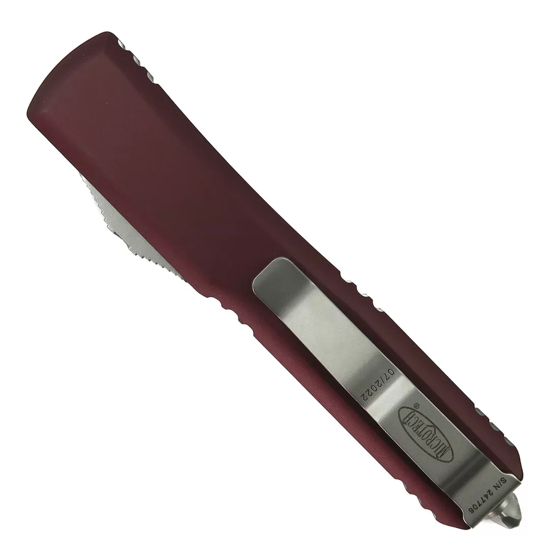 This Microtech Ultratech features a contoured Merlot handle along with a dagger style blade, that is fully serrated on one side and plain on the other. The satin finished blade is M390 Stainless Steel.