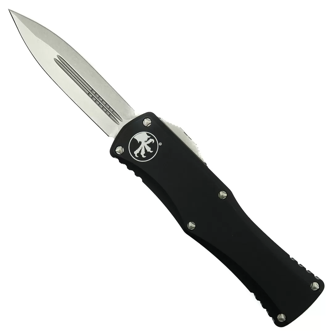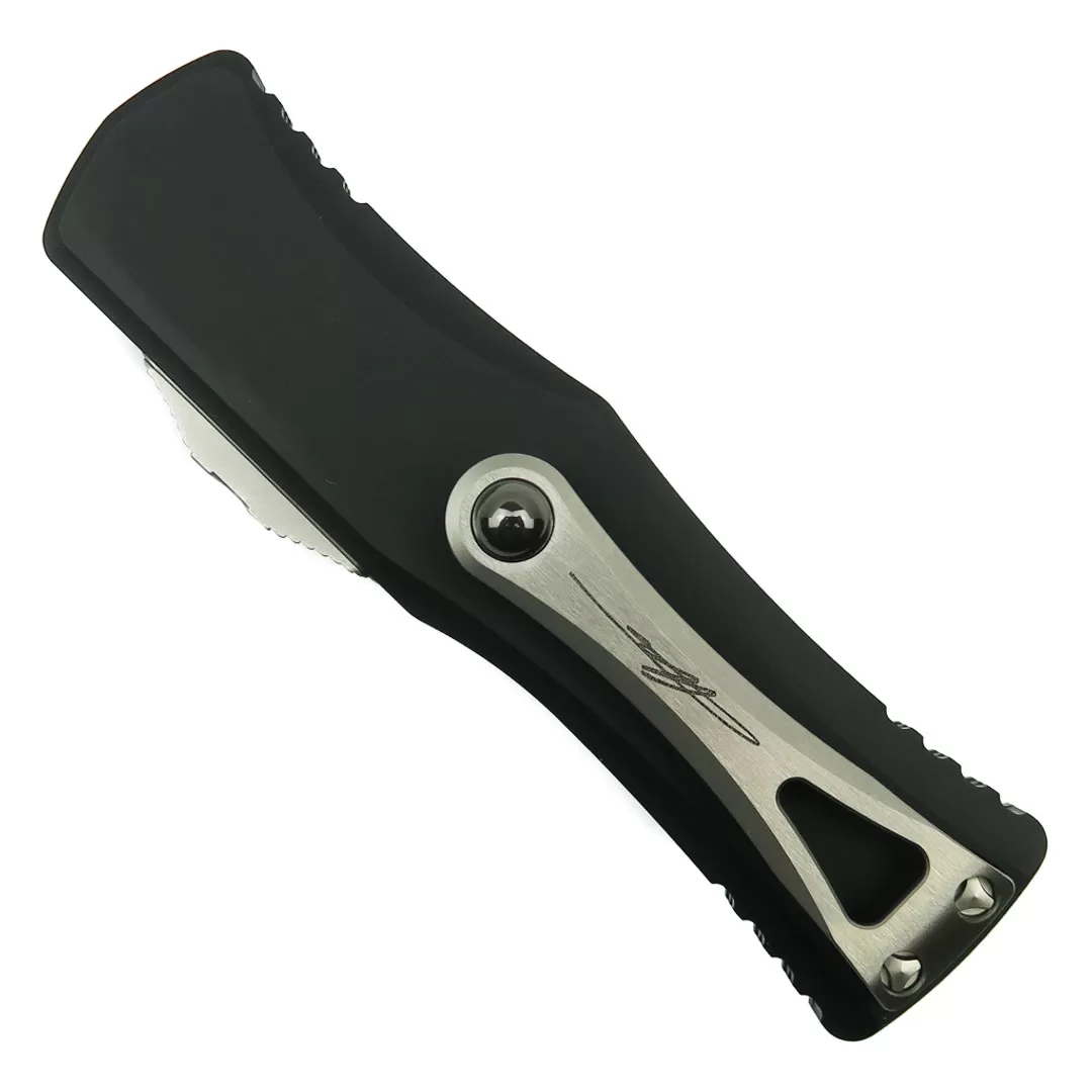 This Microtech Knives Pre-Production Proof Run Hera OTF automatic knife features an M390 dagger blade with a Stonewash finish. The blade is paired up with a black anodized aircraft aluminum handle