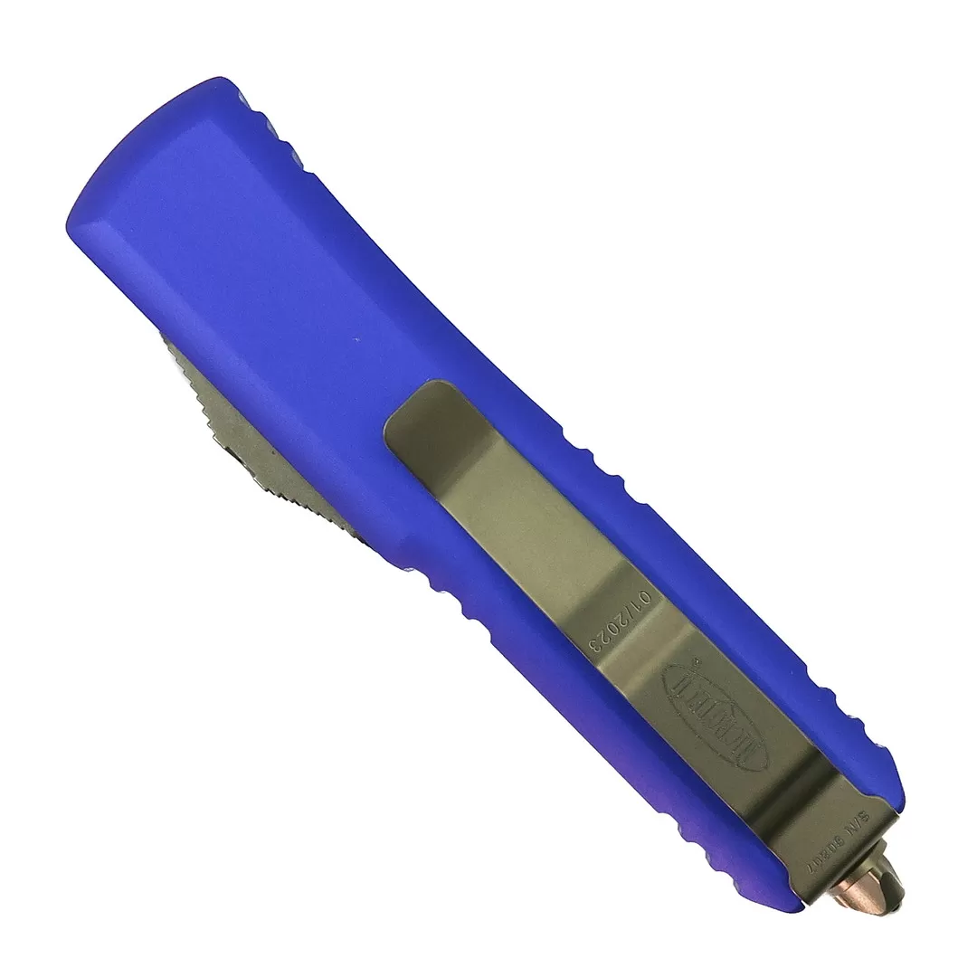 This Microtech UTX-85 OTF automatic knife features a bronze anodized dagger blade. The handle is purple anodized aluminum.