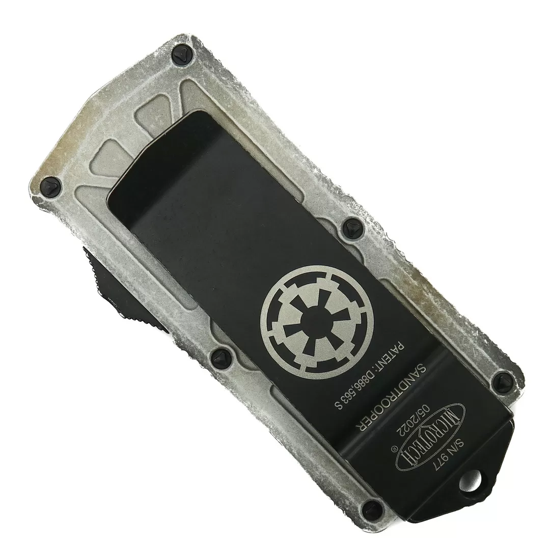 The front of the handle features 3 circle patterns and the clip features the S/N, the Microtech Oval Logo, the birthdate, and the Trooper Logo.