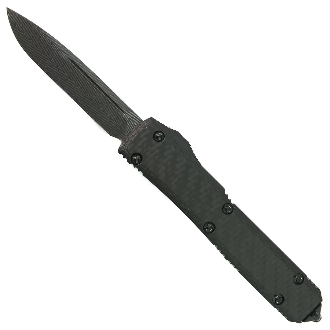 This Microtech Ultratech Signature Series out-the-front knife features a damascus blade and an aluminum handle with a carbon fiber top handle scale. Â