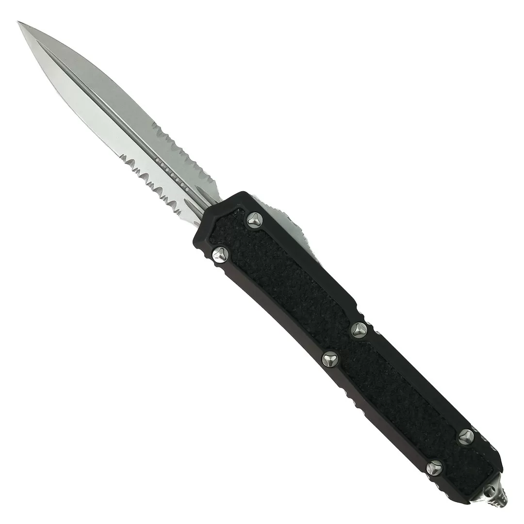 This Microtech Makora OTF automatic features a stonewash finished dagger blade. The blade has partial serrations on both sides.