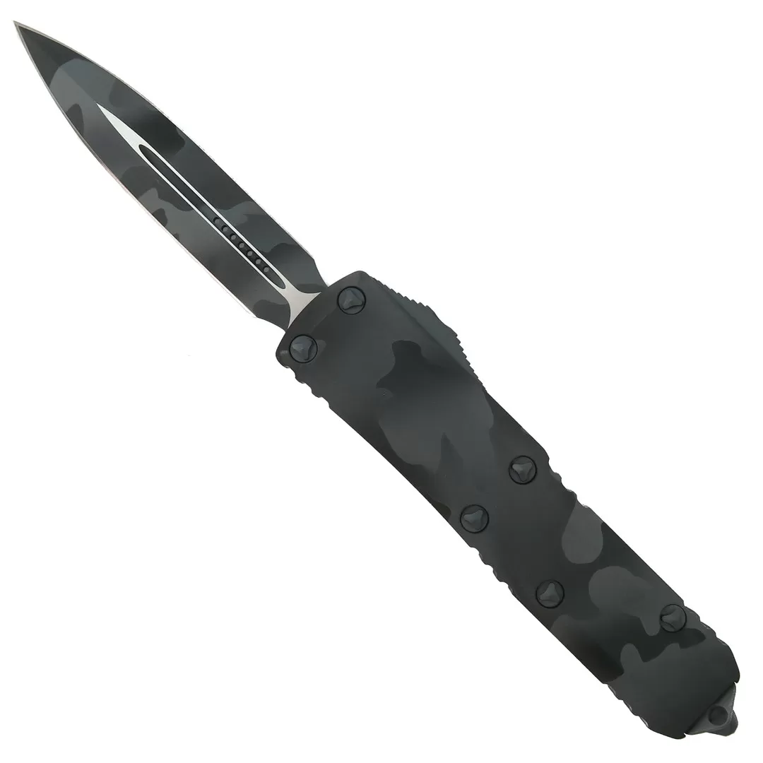 This Microtech Signature Series UTX-85 boasts an urban camo Mil-Spec hard anodized finished handle. The dagger blade has a matching finish.
