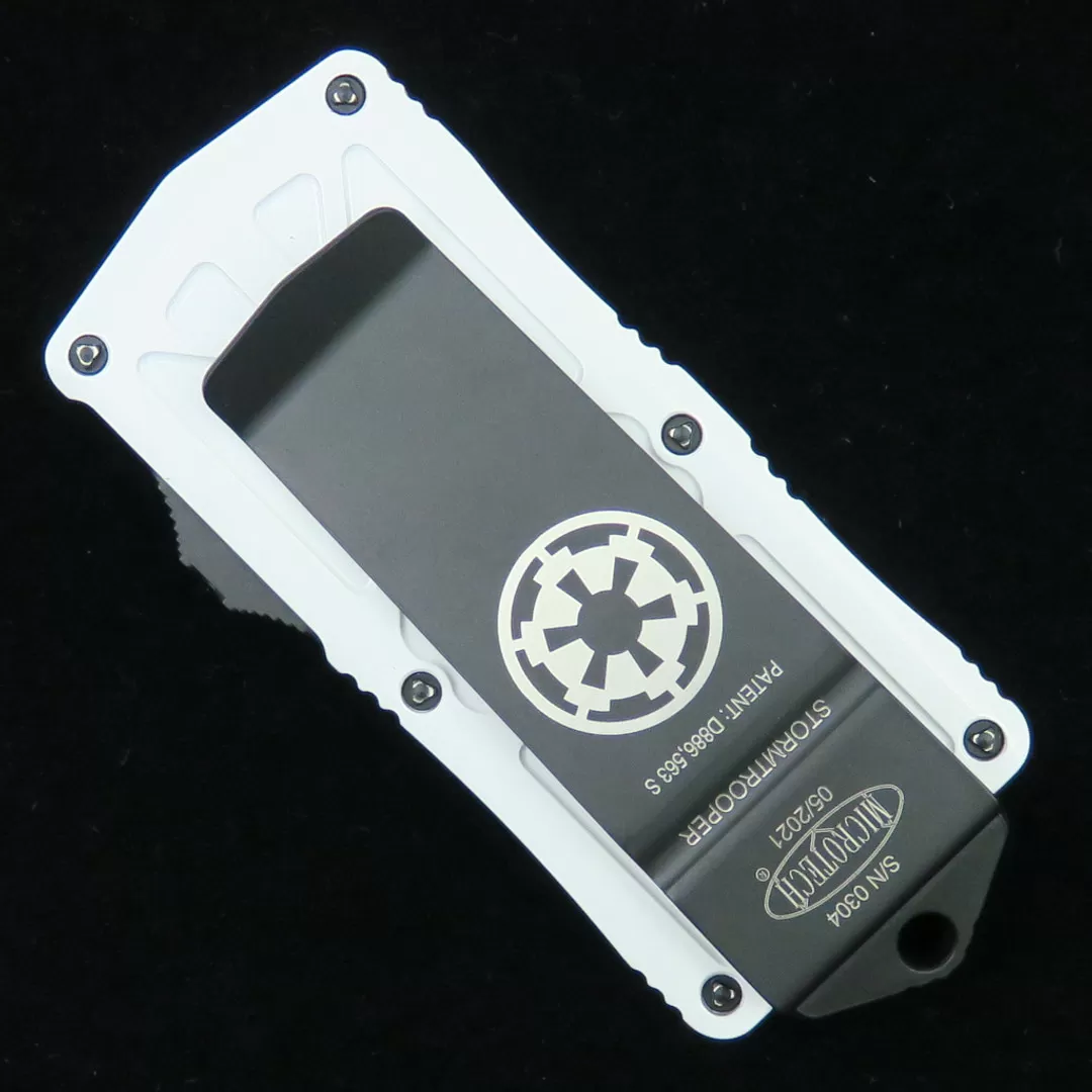 This special Microtech Exocet out the front model features a white handle complete with black hardware, a pocket clip, and a white finished dagger blade.