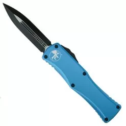 This Microtech Knives Hera OTF automatic knife features an M390 dagger blade with a black finish. The sleek blade is paired up with a turquoise anodized aircraft aluminum handle.