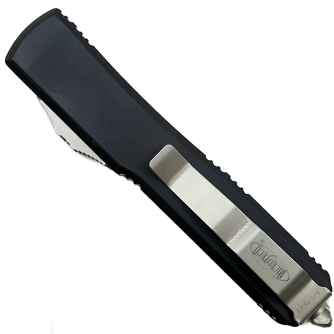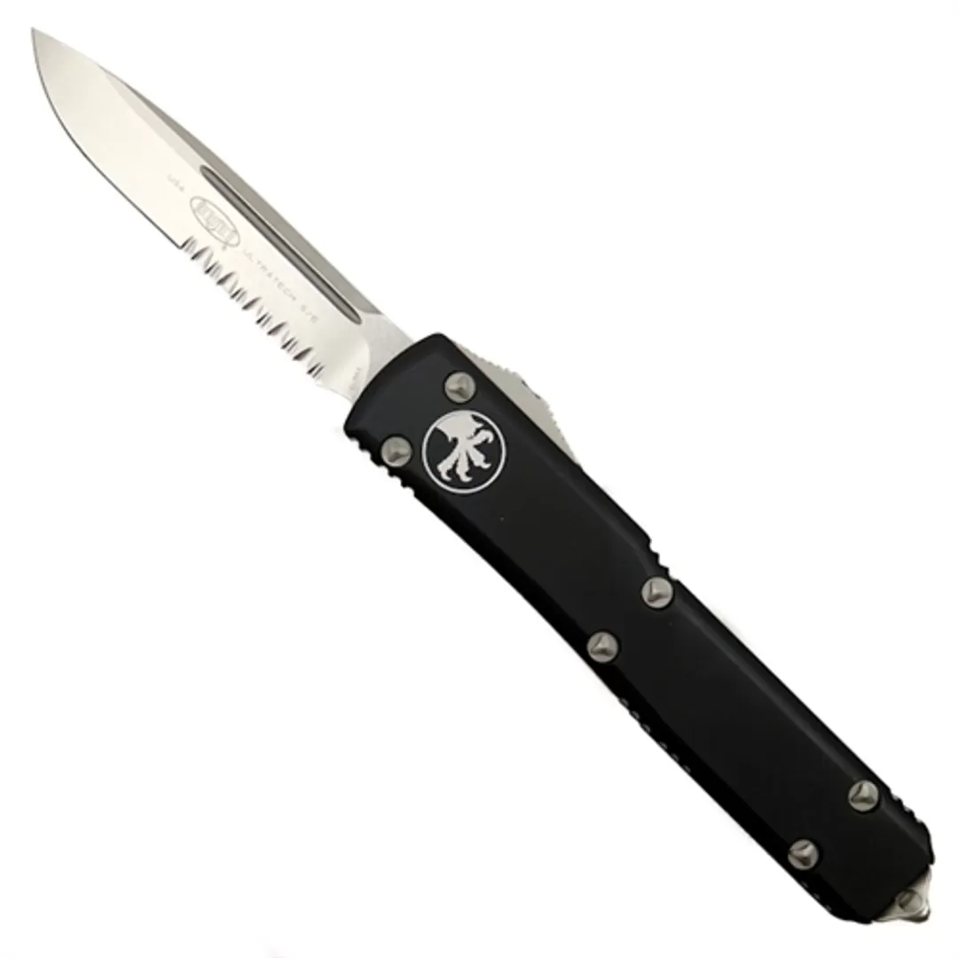 This Microtech Ultratech OTF knife features a contoured black handle complete with standard bead blasted hardware and an integrated glass breaker function along with a partially serrated drop point style blade in a stonewash finish.