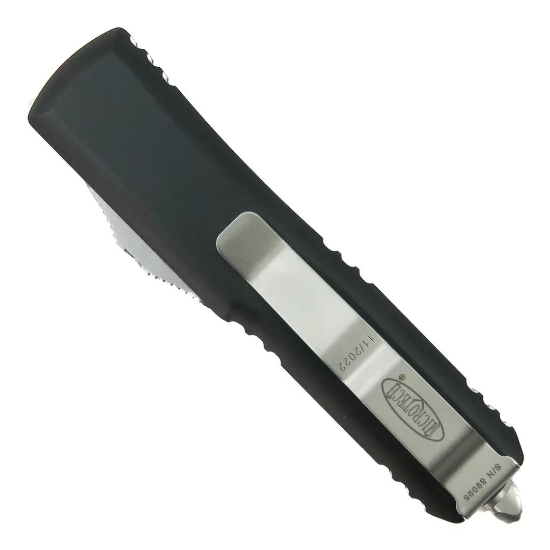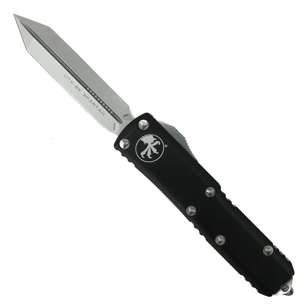 This Microtech Spartan UTX-85 OTF Auto knife boasts a black anodized handle complete with standard hardware and an integrated glass breaker function along with a stonewash finished double tanto “Spartan” style blade.