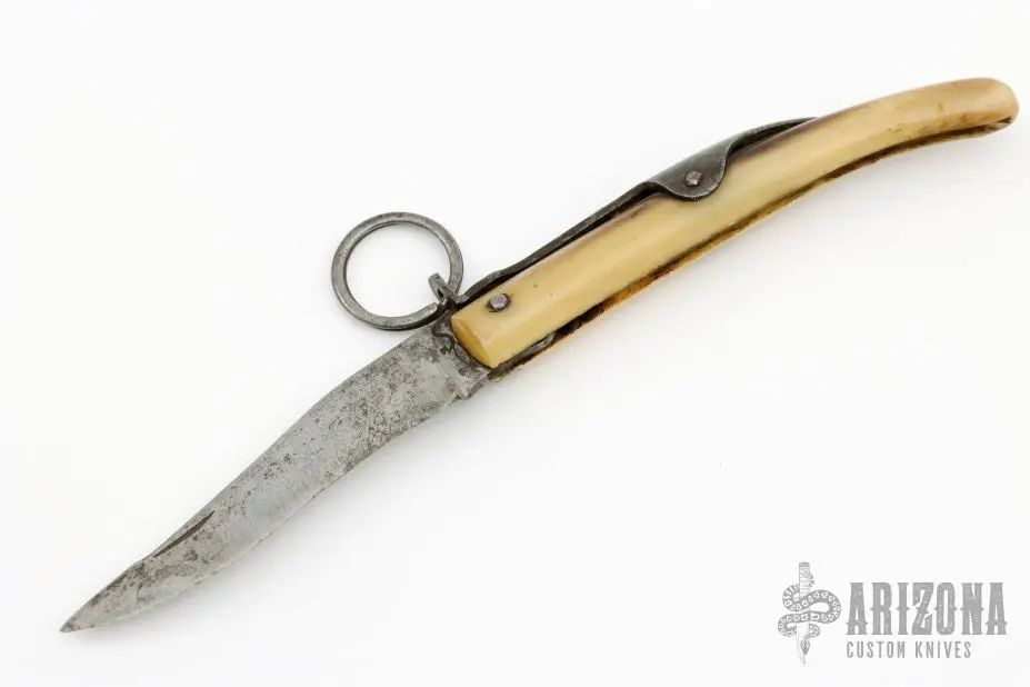 This Mini Navaja by Tarry Levigne has a recurve blade with nail nick. The handle is a single piece of horn with a steel ring lock mechanism on the spine. Has some patina and scratches, otherwise good condition for its age.