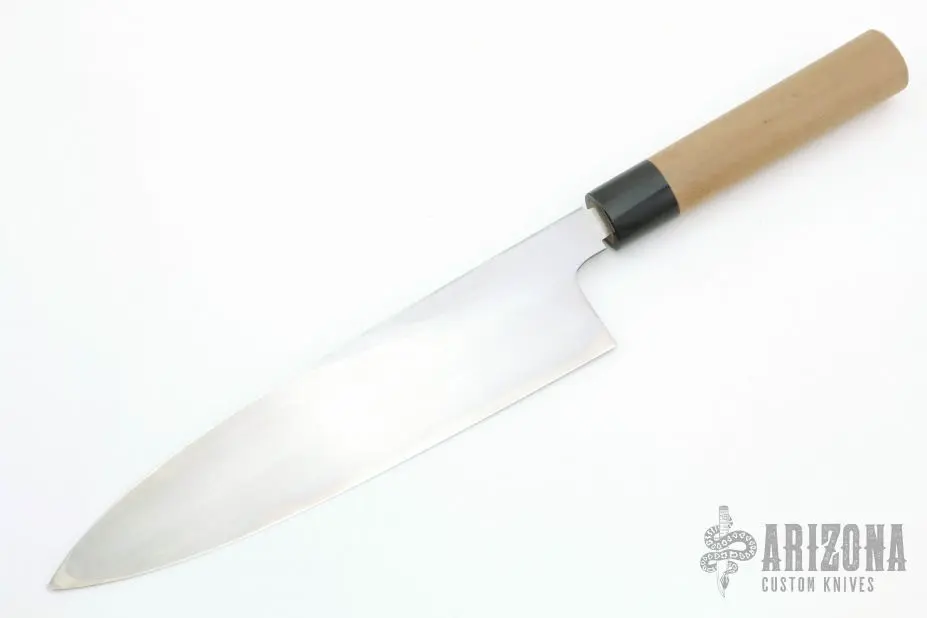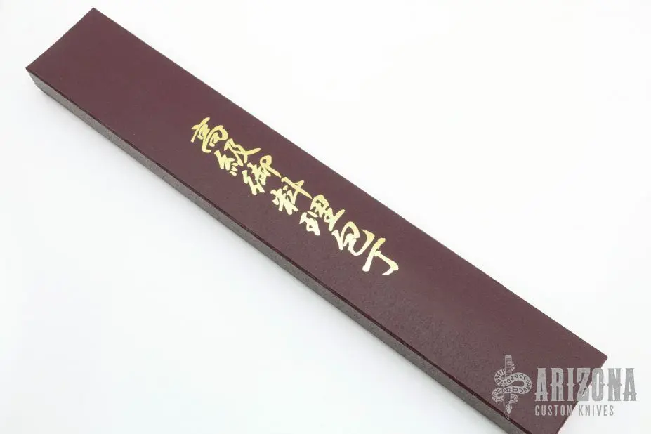 This Deba from Shinichi Watanabe features a stainless clad white steel blade with a hidden tang construction. .227″ Blade Stock. 2.44″ Blade Depth. The handle features horn hilt nicely complemented by a Ho wood grip. This is a fantastic piece that is razor sharp. New from Maker.