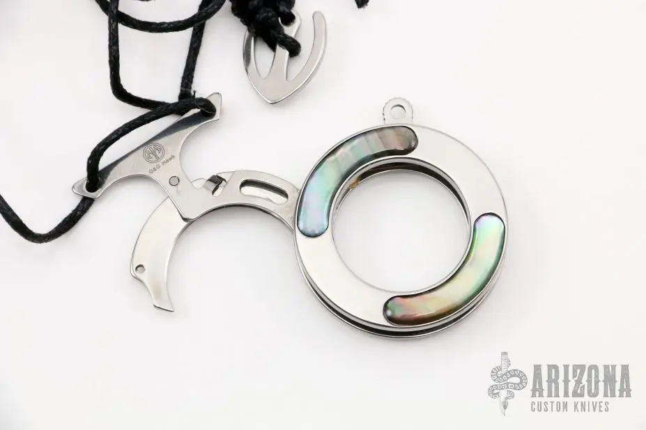 This MK-14 Vicious Circle is a Grant and Gavin Hawk design by Mantis Knives. It is circular pendant that deploys a curved blade when detached from the lanyard. Satin finish with abalone inlays. Includes original box and paperwork. Excellent condition.