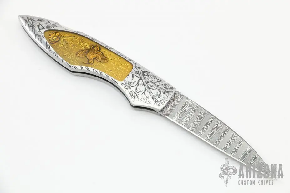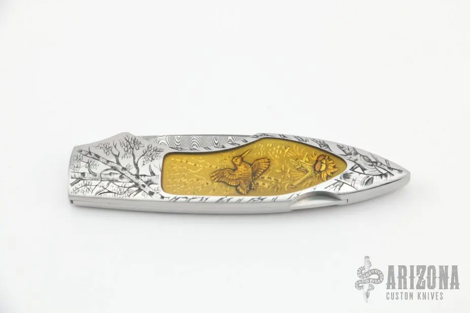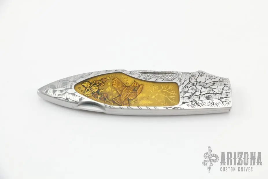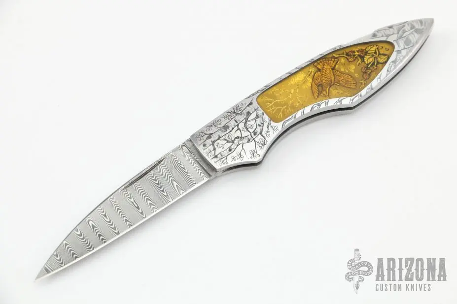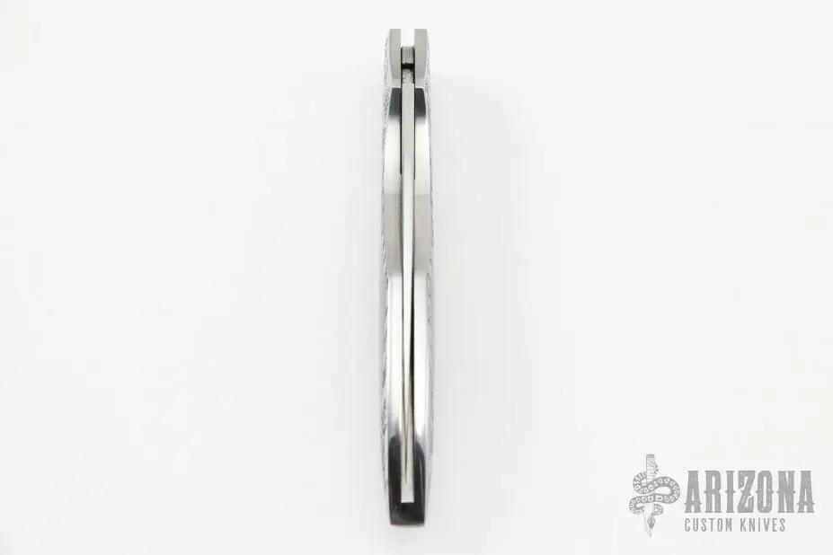 This Interframe lockback by Joe Kious features a Damascus blade with nail nick. The handle has a stainless steel frame with quartz crystal inlays over engraved inlayed plates. The handle has been engraved by Belgium Master Engraver Gino Cargnel, it is stunning. Nice lockup and blade seating. Comes with zippered case. Excellent+ condition.