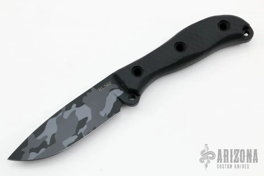 This Mountain Duty by the Busse features an urban multicam cerakoted drop point blade, .190″ blade stock, 1.152″ blade depth, full tang construction with black G-10 scales and a lanyard hole. New from maker.