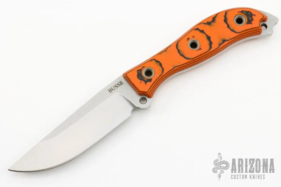 This Mountain Meaner Street by Busse features a stone wash finish drop point blade, .190″ blade stock, 1.152″ blade depth, full tang construction with orange/black scales and a lanyard hole. New from maker.