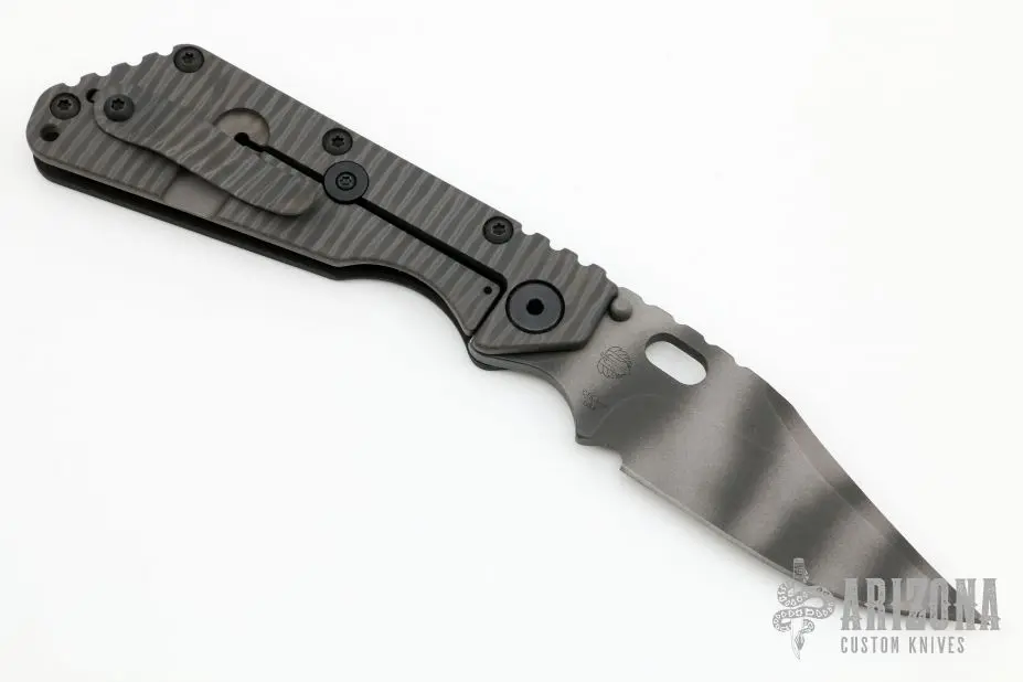 This Mick Strider SMF Bowie framelock folder features a tiger stripe blade with thumbhole and notched thumbrest. The handle has a black aluminum and flamed titanium frame with titanium clip, tip up carry, lockbar stabilizer. Jimping on blade spine. Nice lockup, detent, and blade seating. New condition.