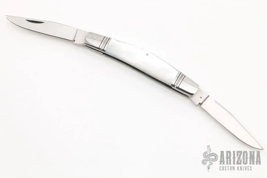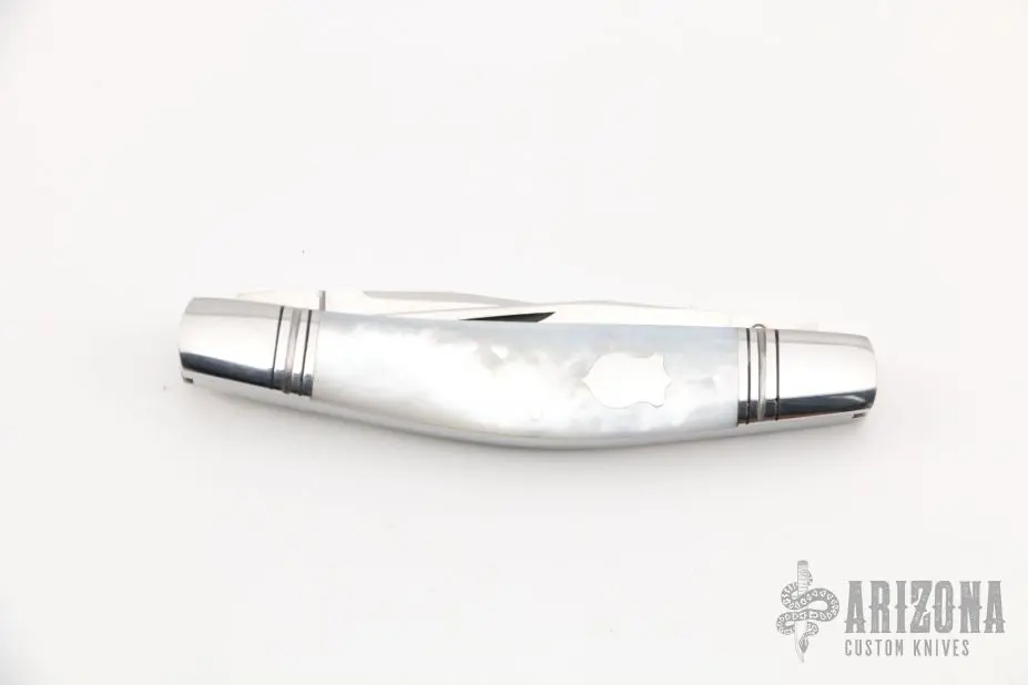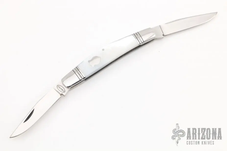 This Muskrat by Dan Burke features hand-rubbed satin finished blades with nail nicks. The handle has fluted and threaded 416 stainless steel bolsters and escutcheon, mother of pearl covers, 416 stainless steel liners and single spring. Has half-stops, flush in all positions. Comes with a zippered case. Excellent condition. Stamped #1.