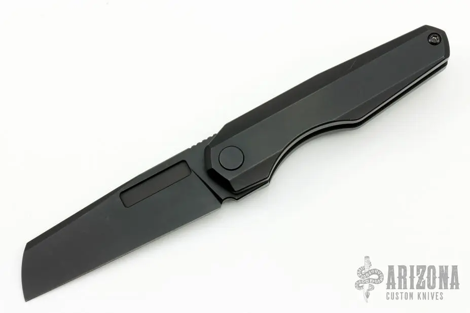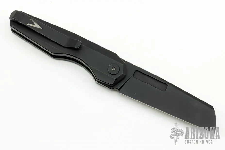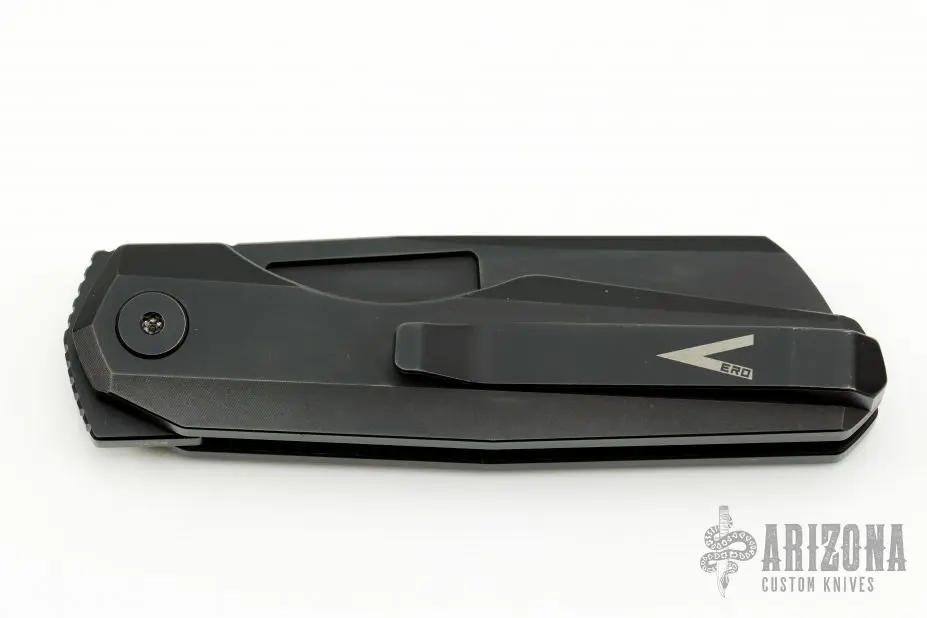 This Neuron by Vero Engineering features a black finished blade with notched thumbrest and flipper. The handle has black titanium frame, tip up titanium clip with hidden screws. Rides on bearings, nice double detent and blade seating. Comes with original box. Â #576. Excellent condition.Â