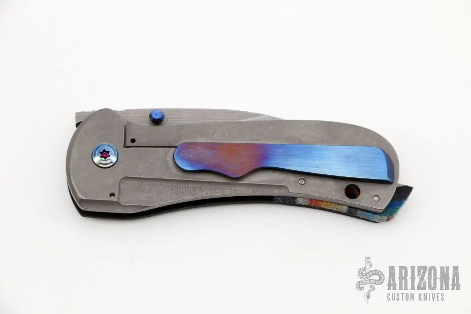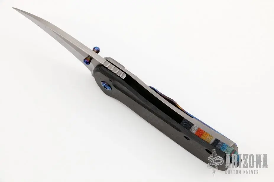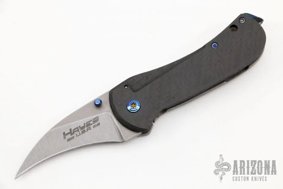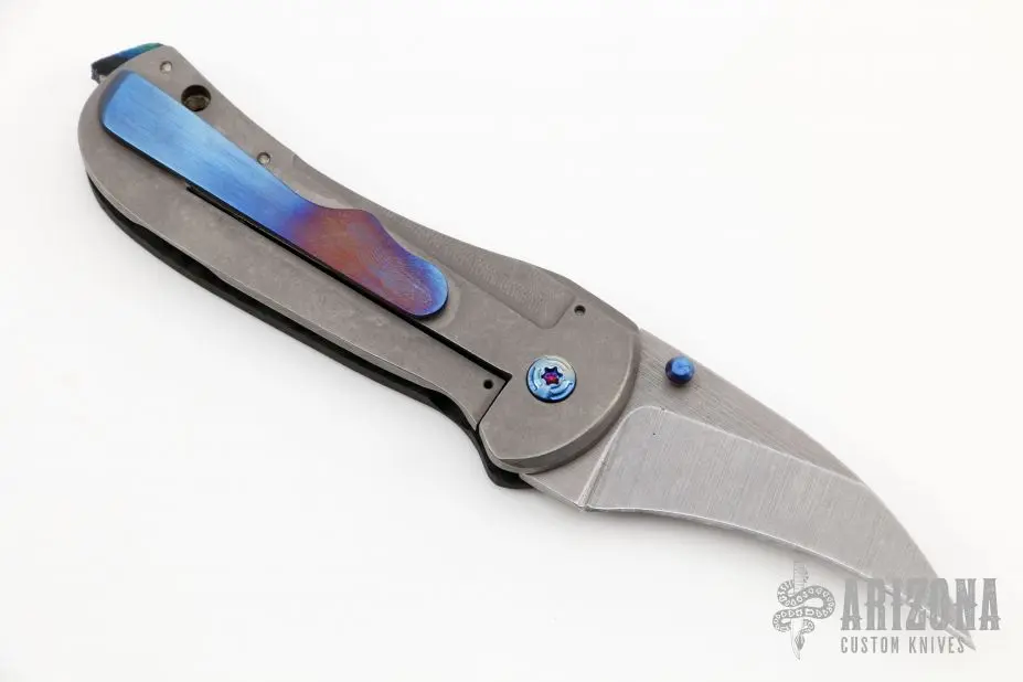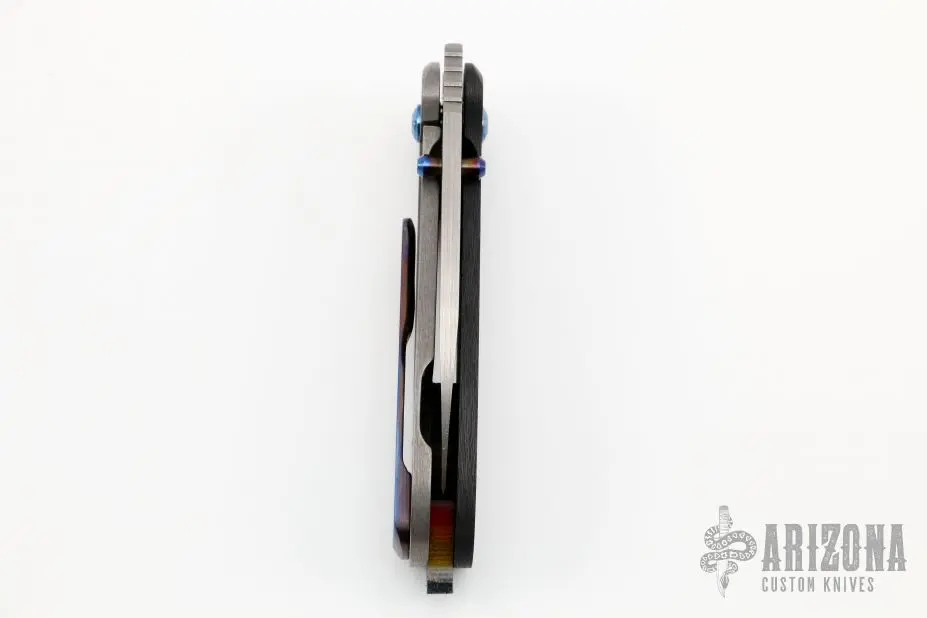 This Osprey by Jon Hayes features a satin finished blade with dual thumbstuds and notched front flipper. The handle has a carbon fiber scale, milled and textured titanium frame with a g-carta backspacer and a satin anodize finish tip up titanium clip with hidden screws. Comes with zippered case and COA dated 11/22. New from maker at the 2022 Nashville Custom Knife Show.