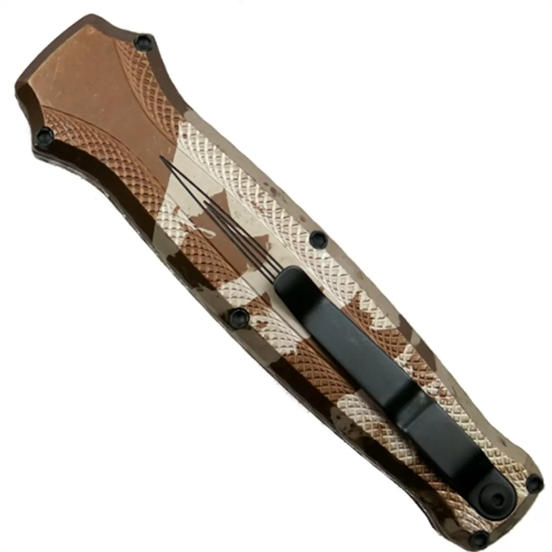 Piranha knives have certainly made their mark in the automatic knives arena for their tight tolerances, consistent quality and competitive pricing. Thanks to their unique custom-like anodized handle colors and a multitude of knife models with their respective blade variations, Piranha can most certainly appeal to every knife user. All models feature all-stainless steel hardware in addition to a titanium pocket clip. The Rated-R, which is Piranha’s second and newest double action out the front automatic knife, showcases aircraft grade aluminum handle scales that have been chamfered and rounded as well as feature a bidirectional texturing for a comfortable and secure feel. The handle scale boasts dual finger grooves on either side and the slide trigger has been placed off-center on the broad side of the handle for maximum control. This model, the P-19CT, features a unique desert camo handle, a clip point style blade in a black finish and the pocket clip is statically designed for tip down carry only. Made in the USA.
